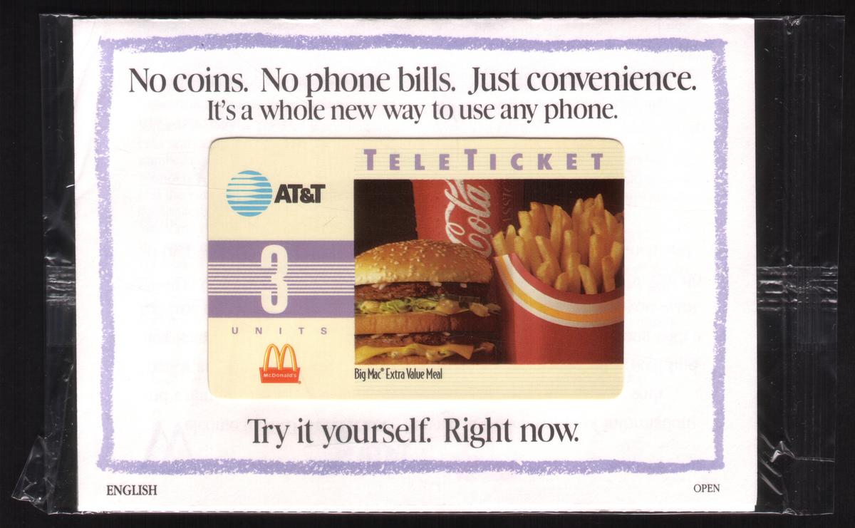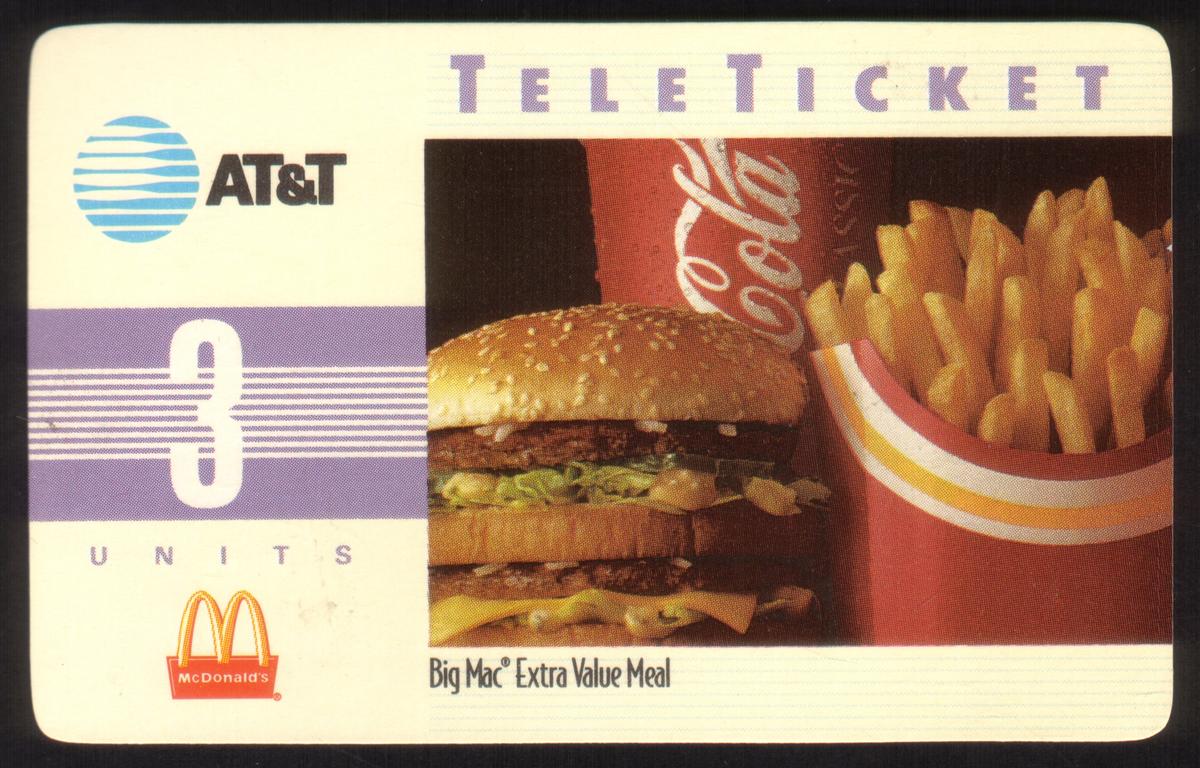 Vintage 1990s AT&T TeleTicket featuring McDonald''s Big Mac, fries, Coca-Cola, and iconic branding, with instructions for use and June 1993 expiration date. |