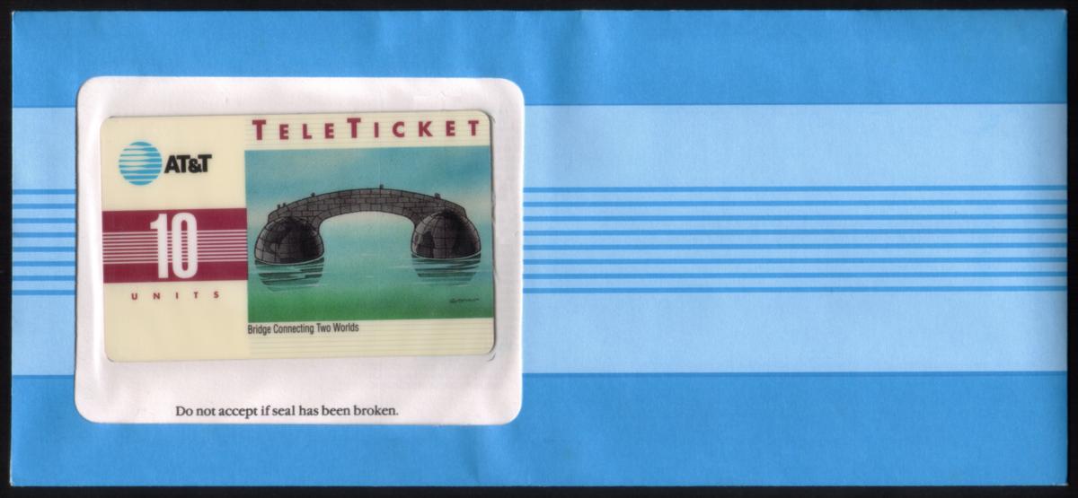 This is an AT&T Teleticket collectible phone card with a value of 10 units. The card number is SKU-10029. The main image features an artistic illustration titled "Bridge Connecting Two Worlds." It shows a distinctive stone bridge with two semi-spherical bases emerging from calm water, connected by an arching span with a figure standing on top. The background transitions from blue sky to green water, creating a serene and symbolic scene.