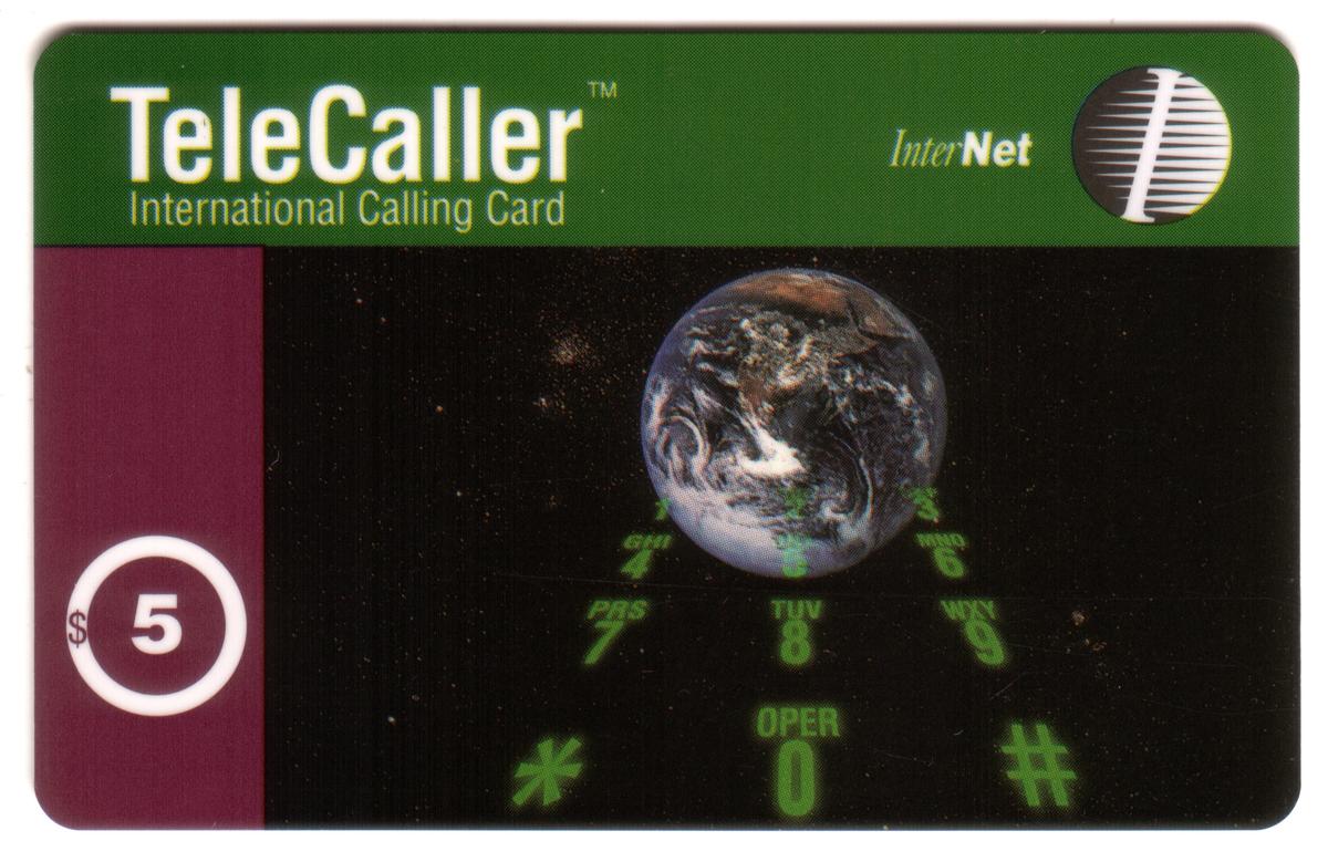 Above the keypad and globe, the text "$5 TeleCaller" is printed, indicating the card’s value and purpose as a telephone calling card. Another notable text element on the card is "InterNet Communication," suggesting the theme of global connectivity through modern technology. The brand or company name “TeleCaller” is associated with the card, reinforcing its identity as a phone card used for communications.