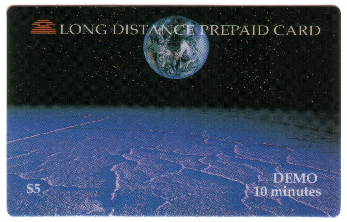 Prominently displayed on the card is the text "LDDS WorldCom," identifying the issuing company. The card carries a denomination of $5, with an additional notation of "(10m DEMO)" which may refer to its usage or validity period. The theme revolves around space exploration, planets, and the world as a whole, consistent with the keywords describing outer space and globes.