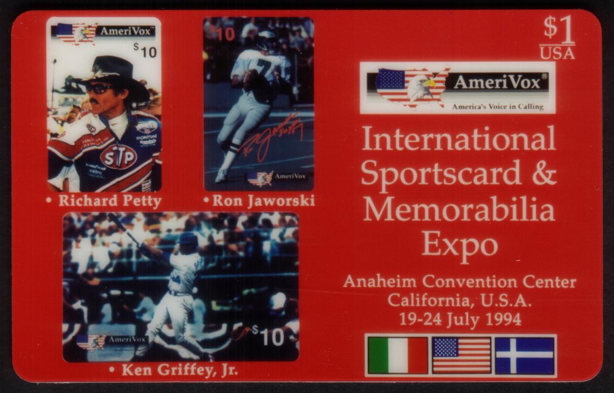 Also included are references to MVPs (Most Valuable Players), underscoring the distinguished status of the athletes featured on the card. The card is connected to a special promotional event: the International Sportscard & Memorabilia Expo held in Anaheim in July 1994. Furthermore, the card has a marked denomination of $1 promotional value, linking it to collectible programs or offers related to the event or to the sportscard market.