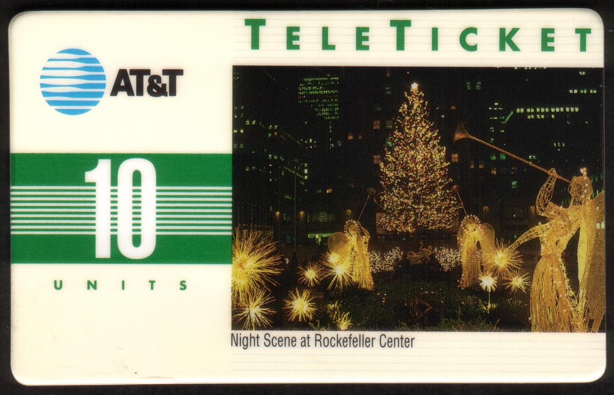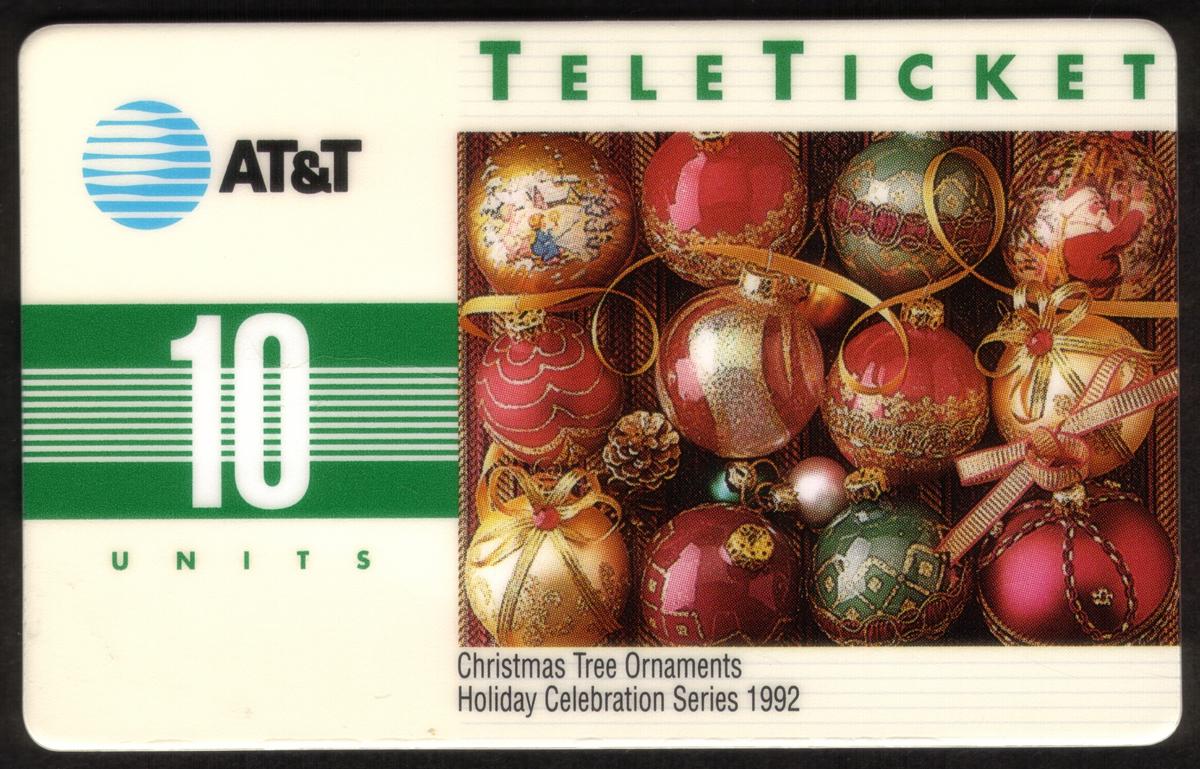These six AT&T Teleticket collectible phone cards from the Holiday Celebration Series 1992 each have a denomination of 10 units, indicated in white numbers on a green striped background. The top left corner displays the AT&T logo, and the top right features the word "TELETICKET" in green capital letters.