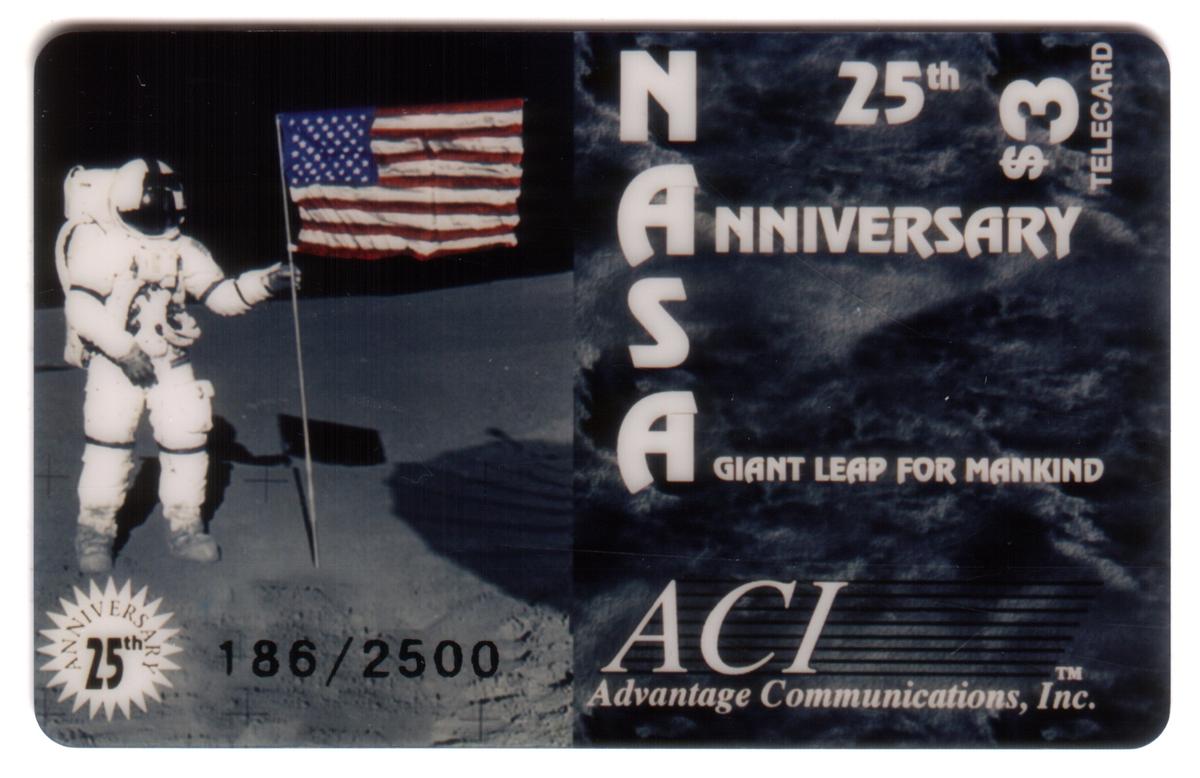 Overall, this phone card is a tribute to American history in space flight and NASA’s legacy. It captures key elements of the Apollo 11 mission by featuring Neil Armstrong and the American flag in a space setting that connects to the 25th anniversary of the Moon landing.