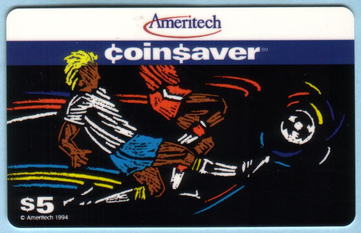 All three cards bear the "Ameritech" and "coin$aver" logos at the top and include the year 1994 printed on the bottom left corner. The series is identified as the Artistic Soccer Series CoinSaver Set of 3, linking these cards as a coordinated collectible set focused on the sport of soccer, aligning with world cup and futbol themes.