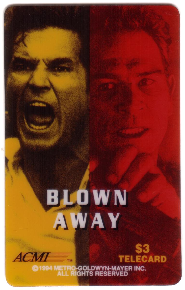 The text on the card includes the title *Blown Away* along with the year 1994 and Metro-Goldwyn-Mayer Inc. The card’s value is indicated as $3, printed clearly to designate the phone card’s usage value. Additional branding includes ACMI, which is an abbreviation for the Australian Centre for the Moving Image, connecting this collectible to fine arts and cinema themes. The overall design uses a monochromatic color scheme with blue and white text, contributing to the dramatic atmosphere related to the thriller genre.