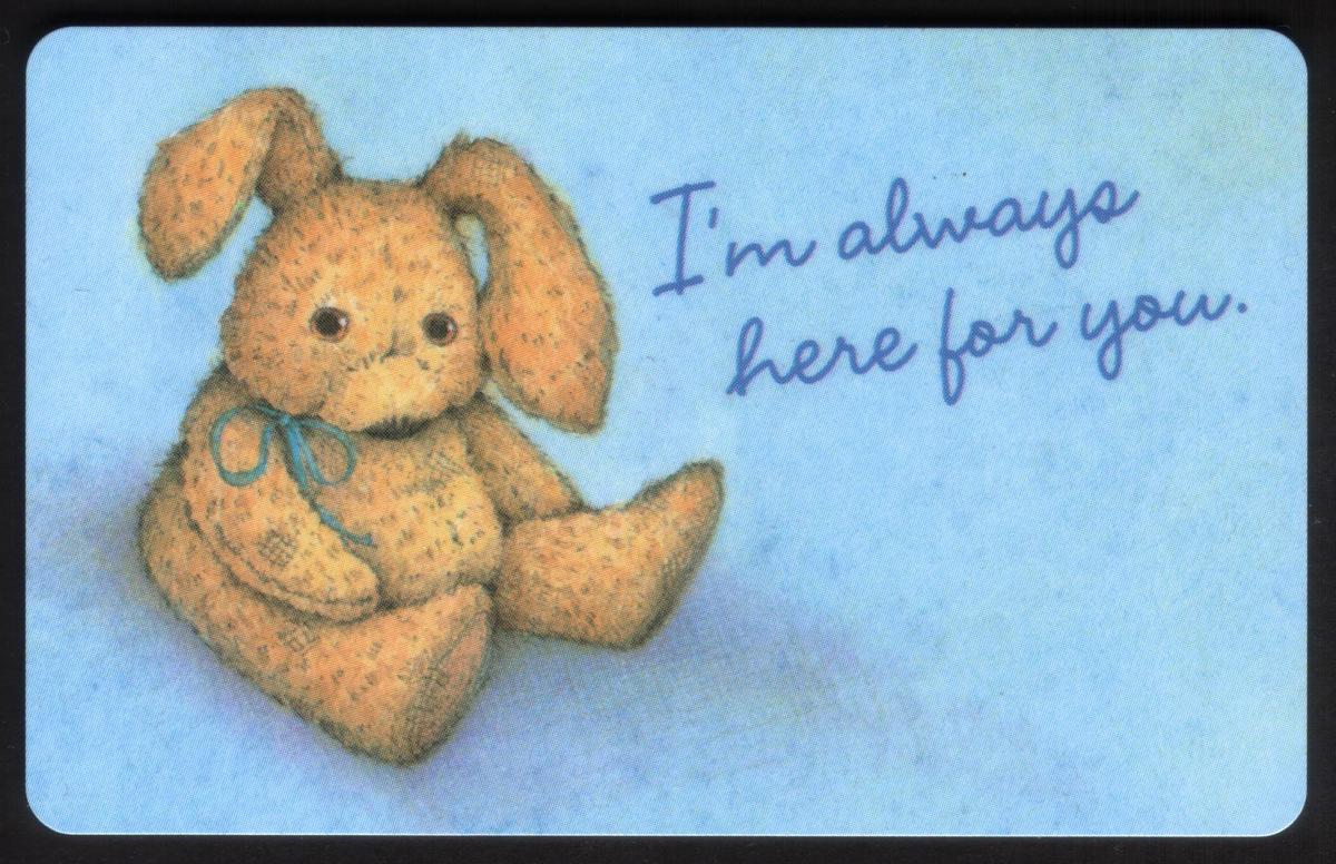 A handwritten-style message in black cursive reads "I'm Always Here For You," positioned toward the upper right portion of the card. The background is a smooth, creamy beige color, keeping the focus entirely on the bunny and the heartfelt message. The overall design conveys warmth, comfort, and friendship.