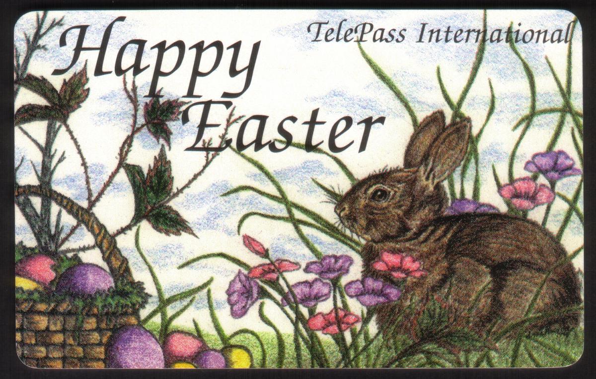 The card includes the text "Happy Easter," prominently displayed in cheerful lettering above the rabbit and eggs. The artwork uses soft pastel colors and delicate line drawings to create a cute and lively appearance. The company name "TelePass International" appears at the bottom right corner, indicating the producer of the card.