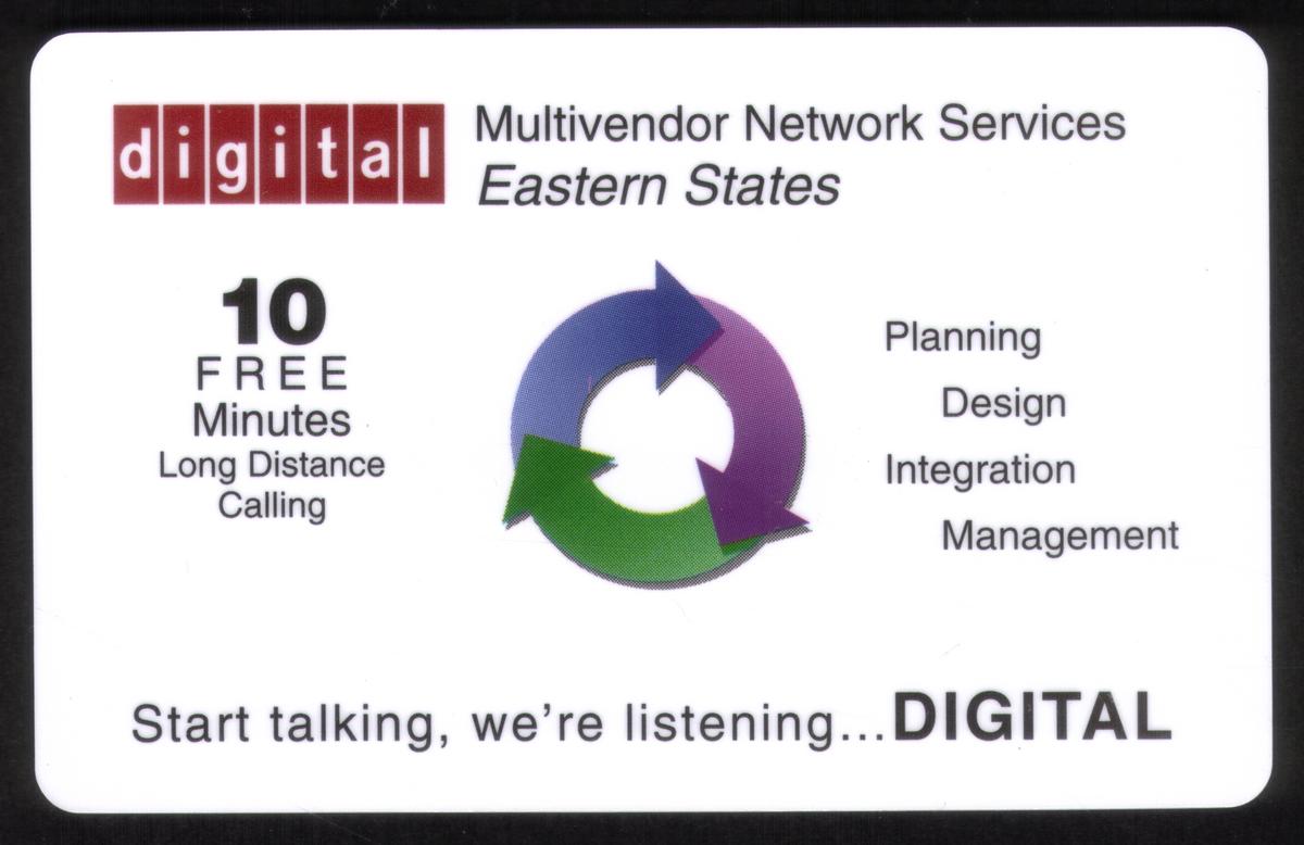 Sleek design featuring Digital Equipment branding, 10 free long-distance minutes, regional focus, and symbols of continuous network services.