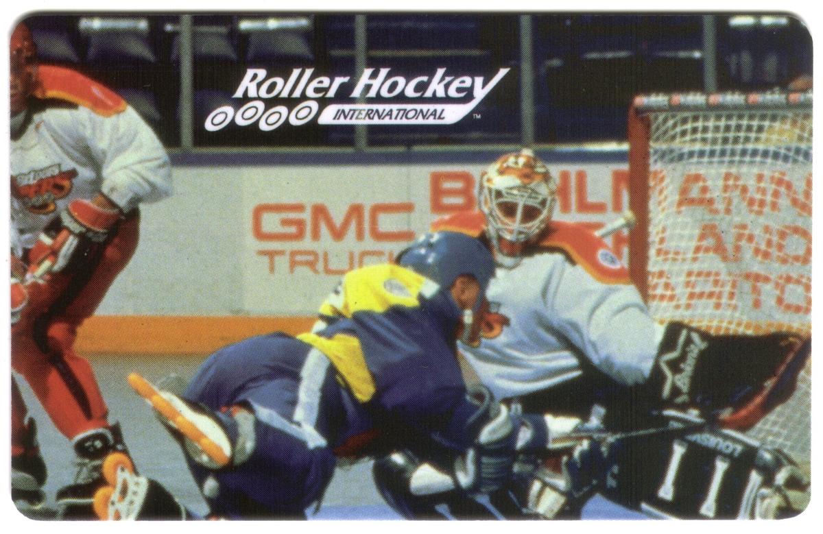 Text on the card includes the words "Roller Hockey International" and the abbreviations "GMC" and "Access Telecom, Inc." The imagery collectively reflects a blend of sport and corporate branding, emphasizing roller hockey and its related industries. The overall presentation celebrates the energy of inline skating within the competitive context of Roller Hockey International.