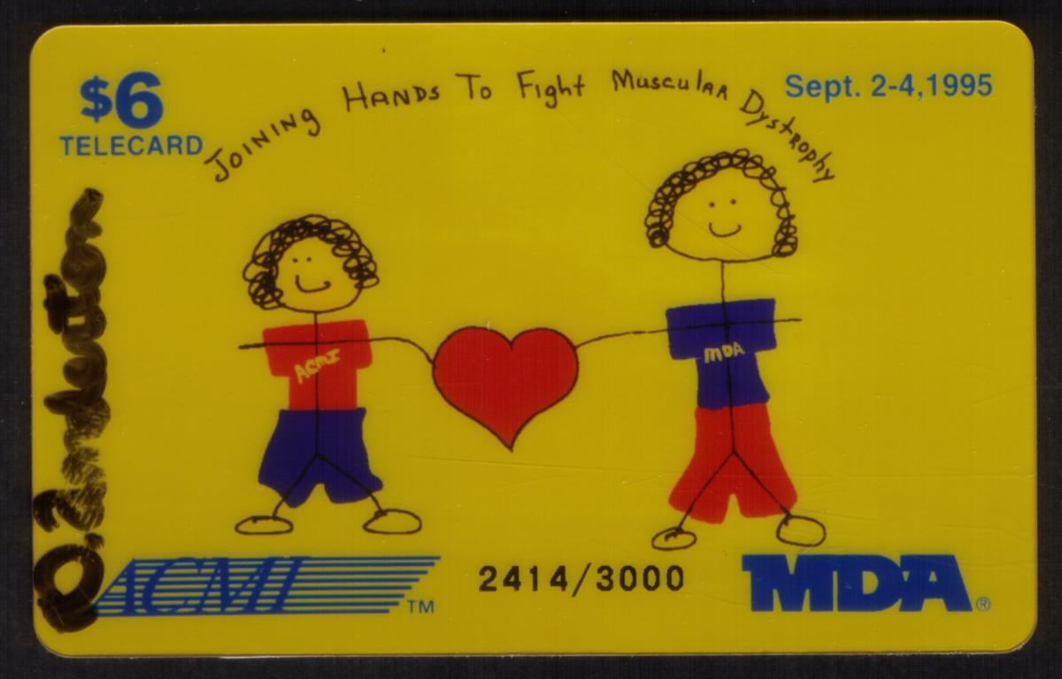 Six-dollar collectible with yellow background, featuring stick figures holding a heart, supporting muscular dystrophy awareness and charity efforts. |