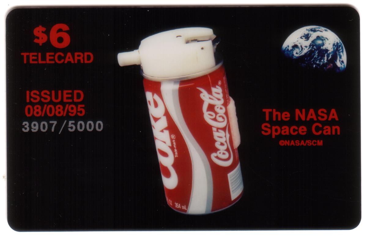 Overall, this card is a collectible item that celebrates the partnership between Coca-Cola and NASA, showcasing the Coca-Cola Space Can against a stellar backdrop. It stands as a tribute to the fusion of commercial branding with space program heritage, capturing the spirit of human curiosity and advancement in aeronautics and space exploration.