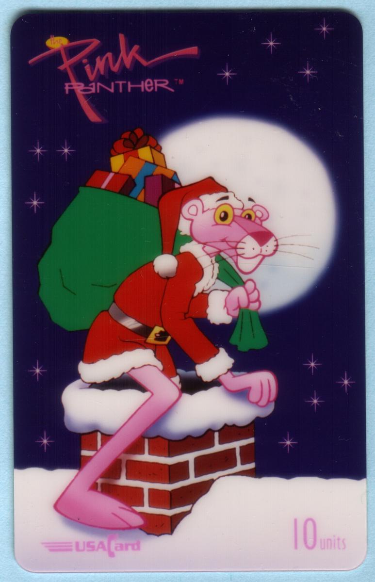 This collectible phone card features the Pink Panther dressed as Santa Claus, sliding down a chimney amidst a festive Christmas setting. The animated character is depicted in vibrant colors wearing a classic red Santa suit with white trim and a Santa hat. The chimney is rendered in brick detail, and the overall color scheme emphasizes holiday themes with reds, whites, and hints of pink matching the Pink Panther’s appearance.
