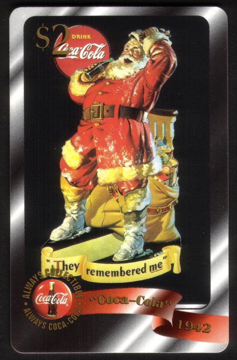 This phone card blends Coca-Cola’s long-standing holiday advertising tradition with collectible design elements that celebrate Christmas. The combination of Santa Claus and Coca-Cola logos emphasizes the brand’s iconic association with the holiday season.