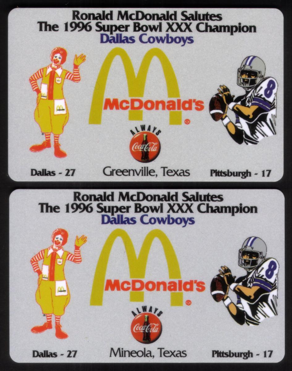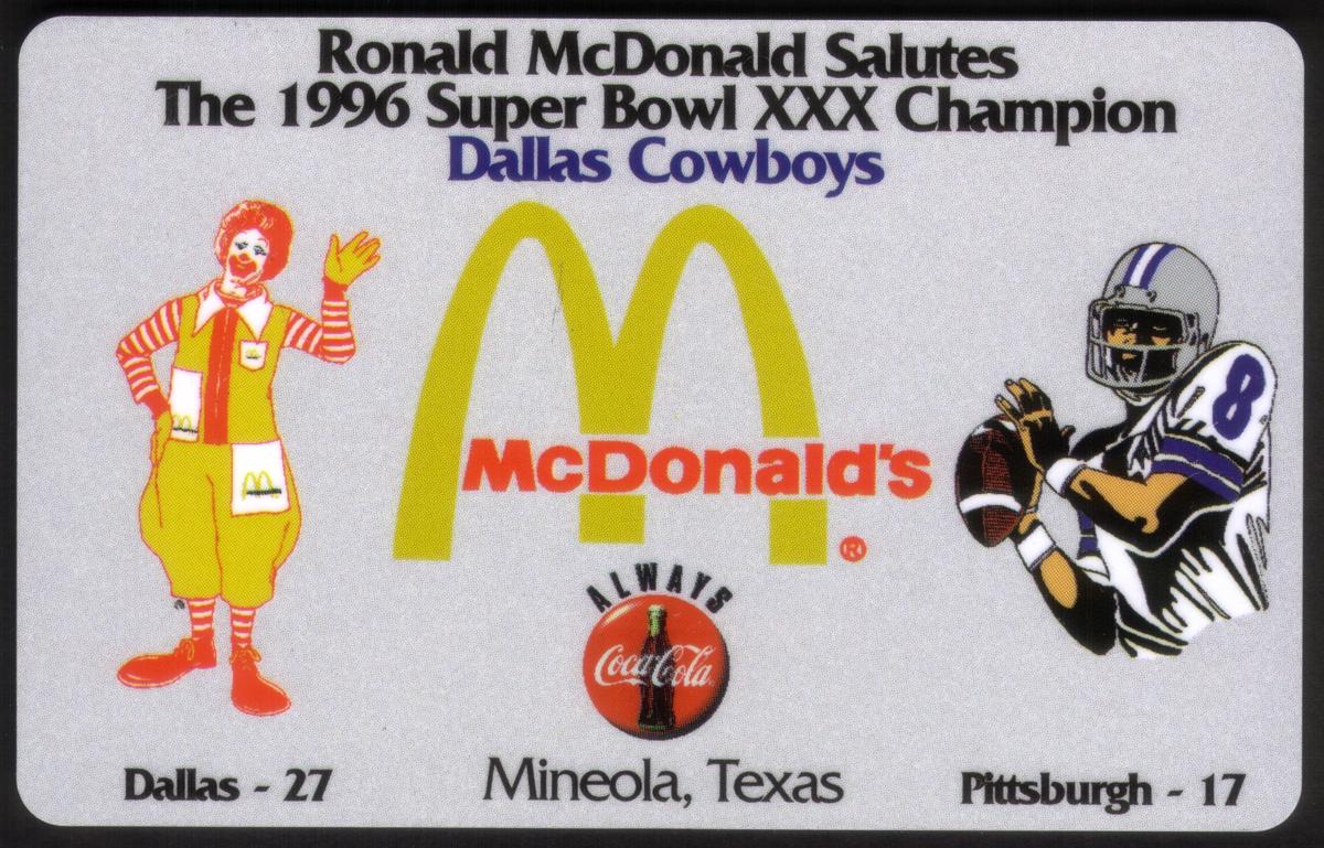 Keywords: setof, Sports: Football, McDonalds, corporate logos, sports: football, Coca Cola logos, Coke logos, Americana, Super Bowls, football teams, texas, ronald mcdonald salutes the 1996 super bowl 30 champion dallas cowboys, coca-cola, coke, CommCard, Inc.