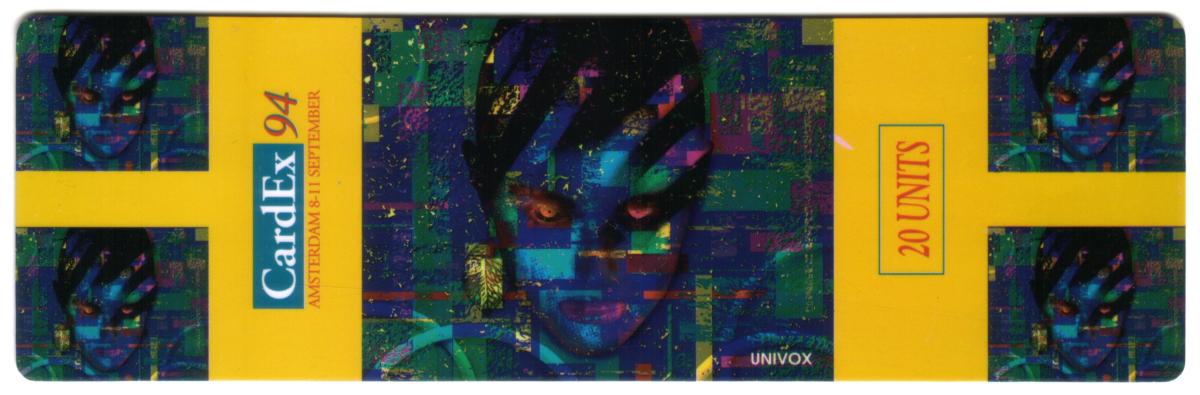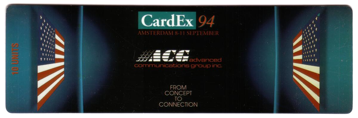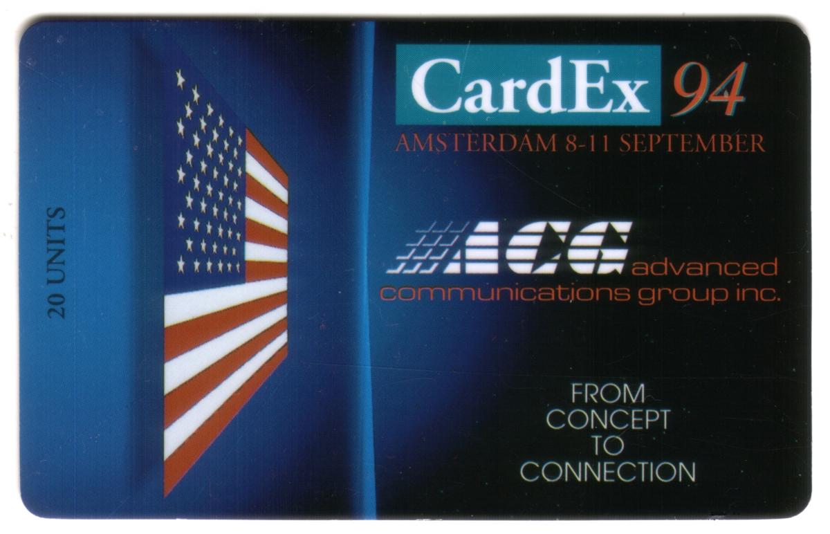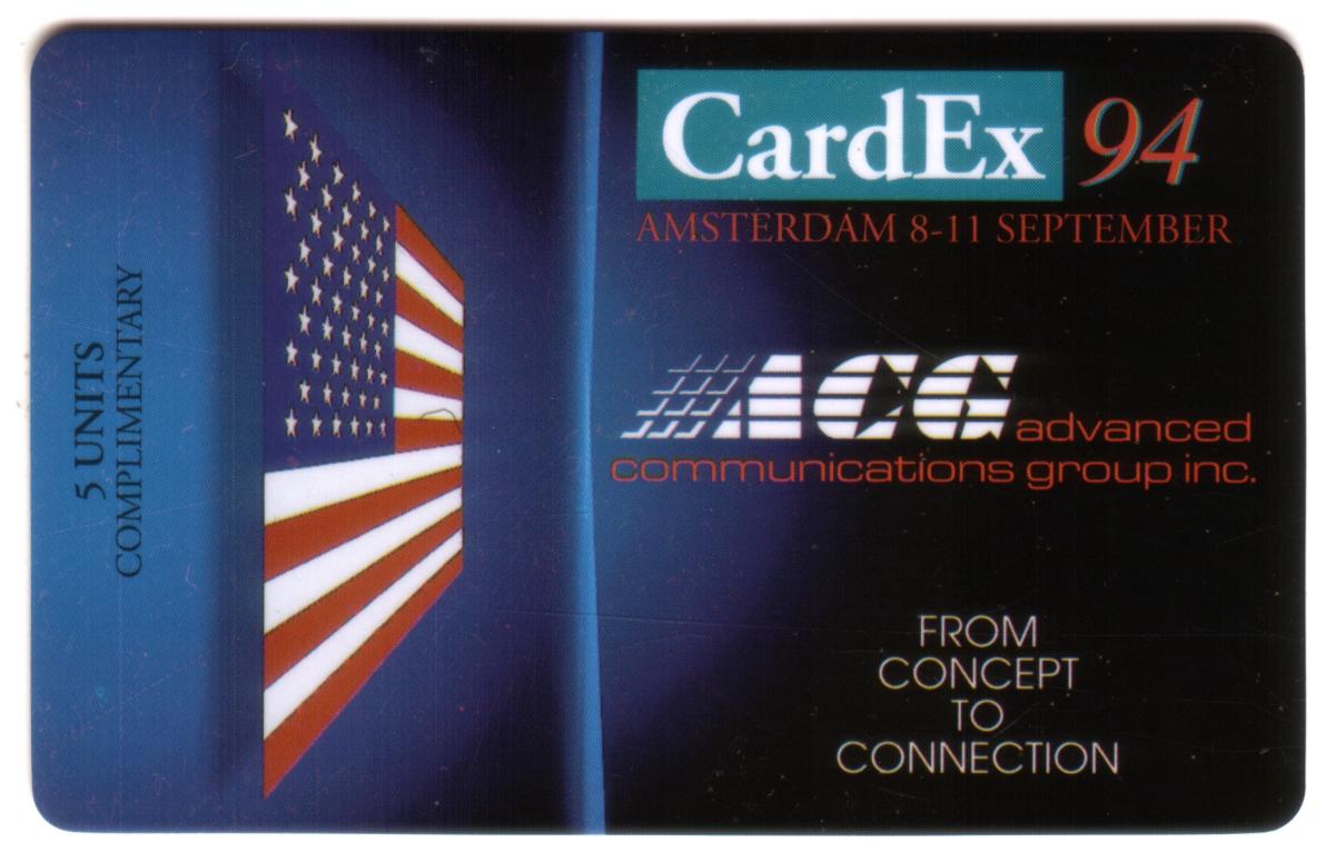 These cards represent a set issued for CardEx '94, emphasizing the role of ACG as a telecommunications company, and they reflect modern graphic design with abstract elements that blend patriotism and corporate branding for the US-based exhibitor.