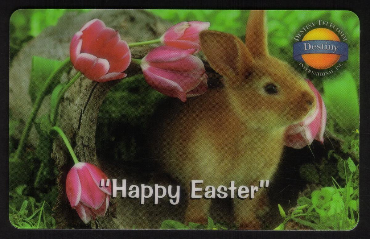 The card has the text "Happy Easter" prominently displayed in an elegant script at the top left corner. In the bottom right corner, the name "Destiny Telecomm" appears, indicating the card’s issuer. The overall design incorporates the themes of Easter, rabbits, and spring flowers, connecting to the holiday’s traditional symbols.