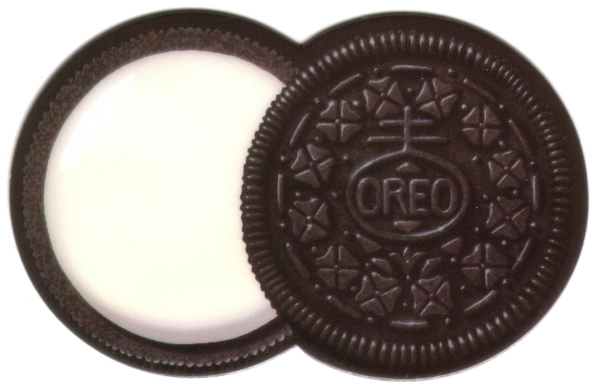 This collectible promotional die-cut card features a detailed image of an Oreo cookie, with one half showing the embossed chocolate cookie top and the other half displaying the cream filling. The Oreo cookie's classic design is clearly visible, including the intricate patterns and the central "OREO" embossed text on the cookie top. The card is shaped precisely to the contour of the cookie halves, emphasizing the distinct contrast between the dark chocolate cookie and the white cream layer.