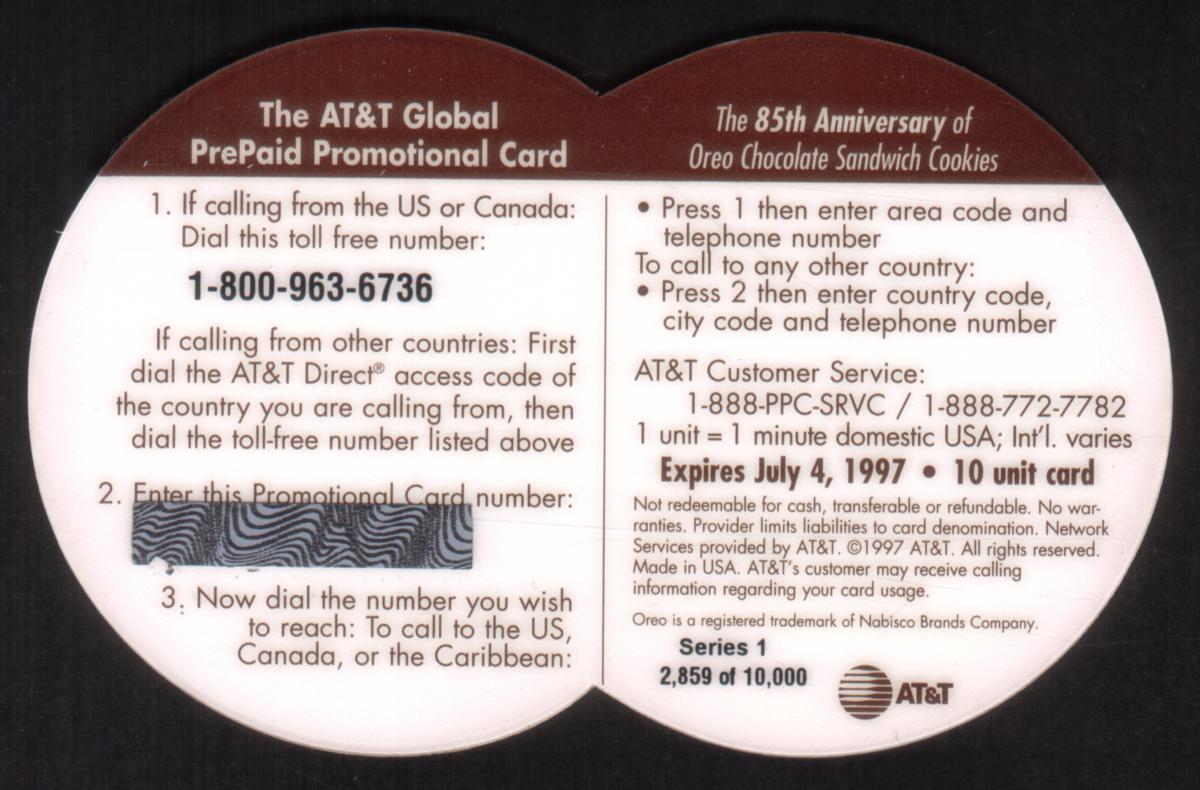 The card is associated with Nabisco Oreo Cookie and contains no additional text or branding visible on the front. It is linked to AT&T, reflecting its promotional nature. This card is part of a set of 10 units related to food, sweets, and cookies, designed to highlight the iconic Oreo product through its unique die-cut format.