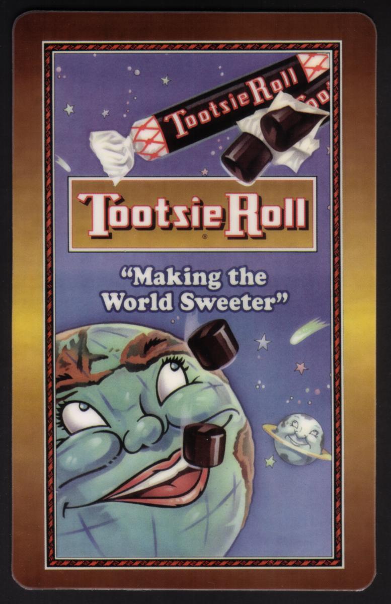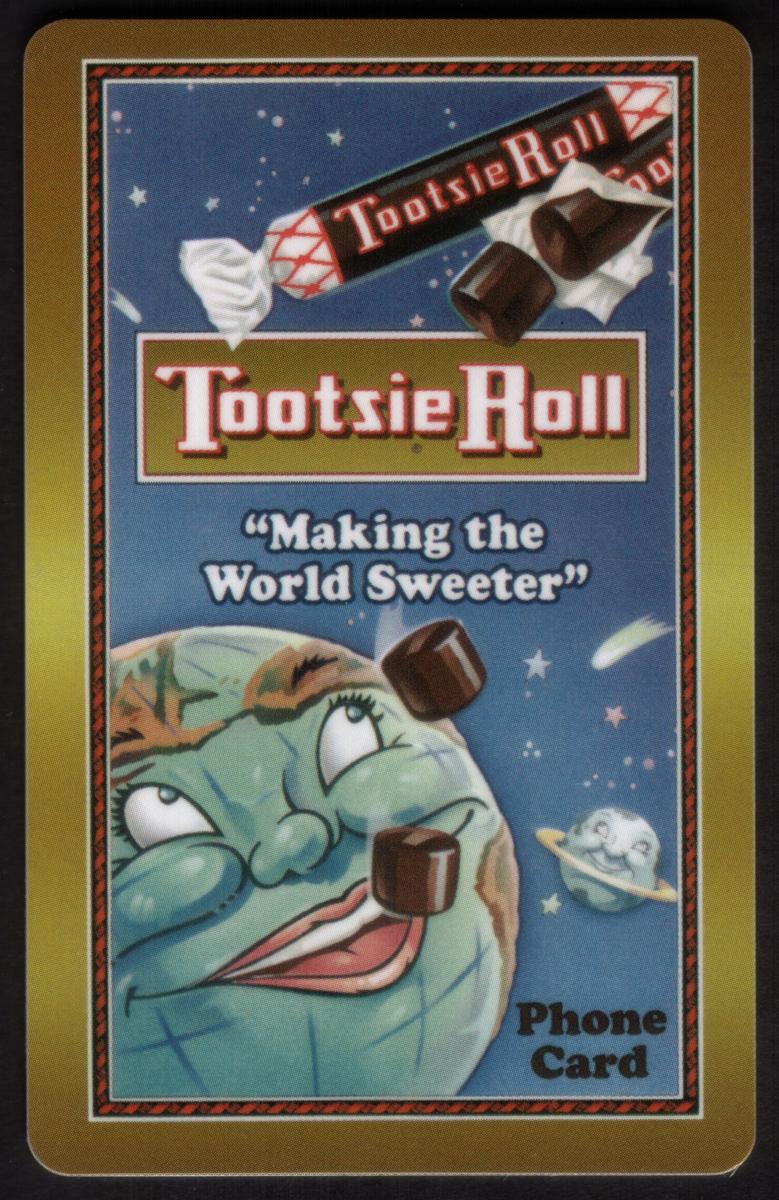 Bright Tootsie Roll themed phone cards featuring cartoon Earth, space motifs, and the slogan Making the World Sweeter, blending fun, nostalgia, and collectible appeal. |