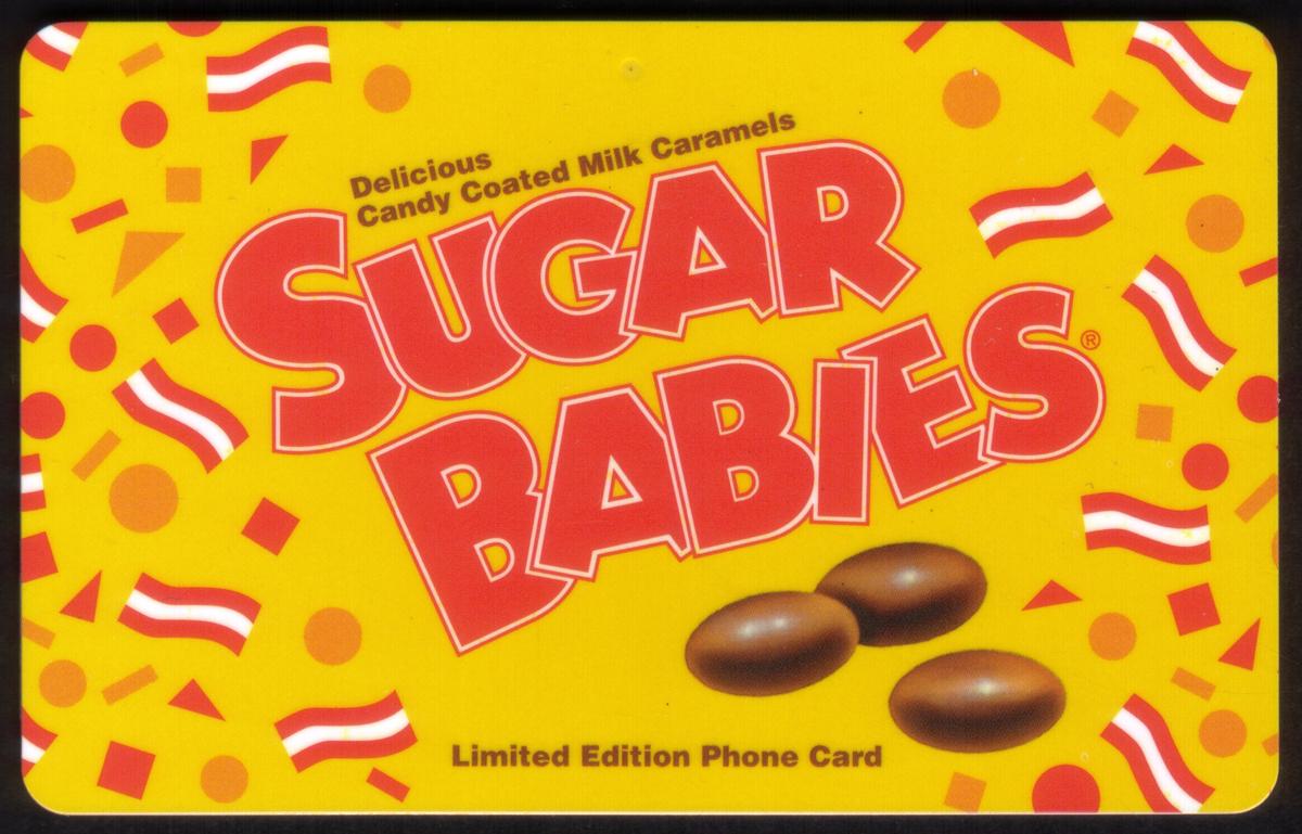 This promotional phone card highlights Sugar Babies, a well-known candy brand famous for its candy-coated milk caramels, combining vibrant colors and clear branding to attract collectors and fans of nostalgic sweets.