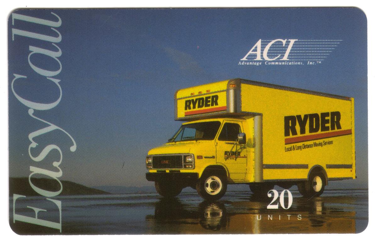 Set of Ryder Truck Rental promotional phone cards from the 1990s featuring branding, instructions, and marketing imagery highlighting transportation and communication. |