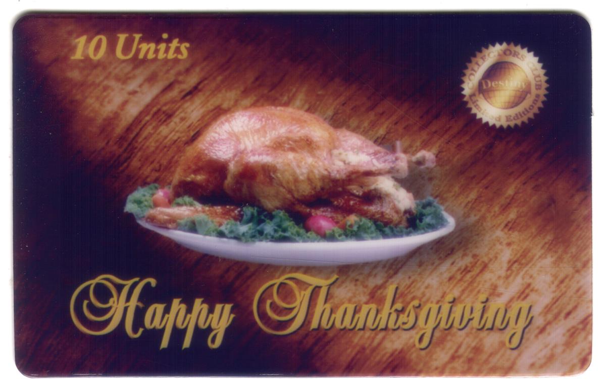 Overall, this phone card celebrates Americana and national holidays with a focus on Thanksgiving. The image captures the spirit of the holiday through the centerpiece turkey and accompanying festive details. The card is part of a 10-unit series indicated by the "10u" marking near the top right beneath the Destiny logo.