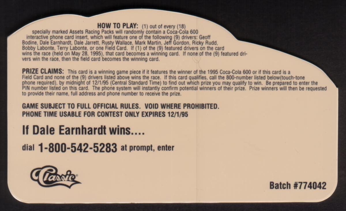 The shape of the card follows the silhouette of the car, die-cut to match the vehicle's outline, enhancing its visual appeal. This chip card captures the essence of Dale Earnhardt’s iconic Goodwrench racecar from the NASCAR circuit, especially linked with the Coca-Cola 600 event.