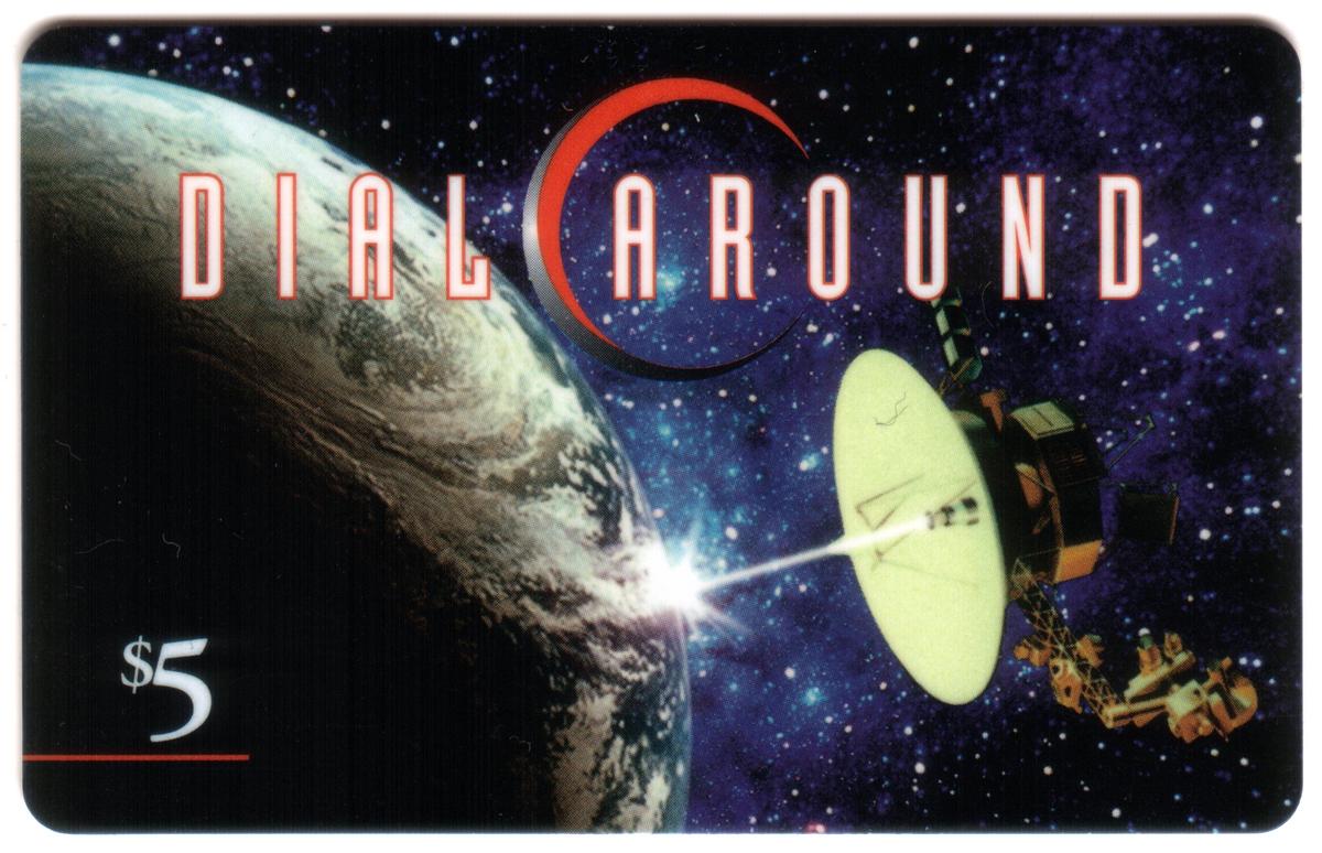 The card displays the branding "American Digital Net" and includes the text "$5 'Dial Around'" indicating its value and purpose for telecommunications use. The design highlights the relationship between satellites, earth, and telecommunication networks, reflecting advancements in IT and space-based communication systems.