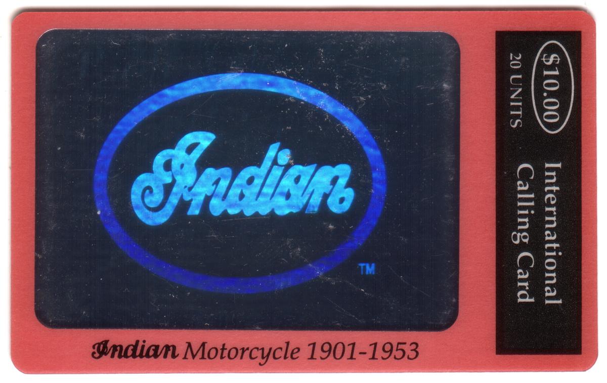 This American Telecard is associated with the Indian Motorcycle brand and commemorates the period from 1901 to 1953. It is an International Calling Card with 20 units valued at ten dollars. The card’s hologram foil highlights the iconic Indian Motorcycle logo, emphasizing its historical significance in motorcycle transportation.