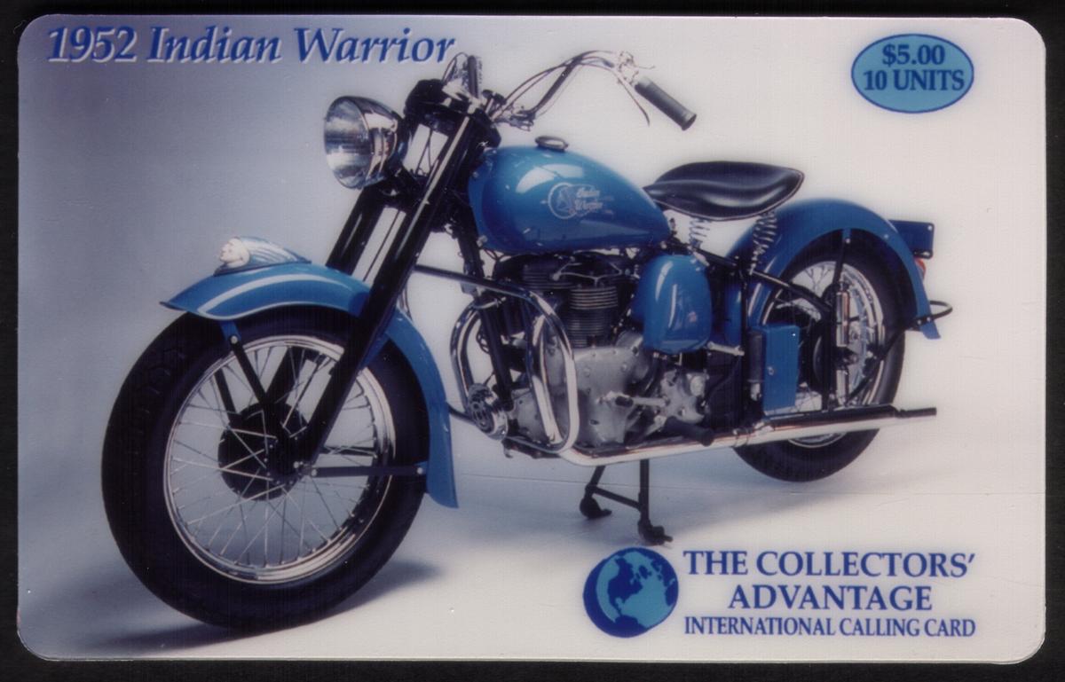 The colors on the card include a combination of earthy and metallic tones that emphasize the motorcycle’s classic aesthetic. Text on the card includes the denomination "$5" and the words "1952 Indian Warrior Motorcycle," clearly identifying the model and year of the motorcycle depicted. The card is a collectible transportation-themed telephone card from the United States.