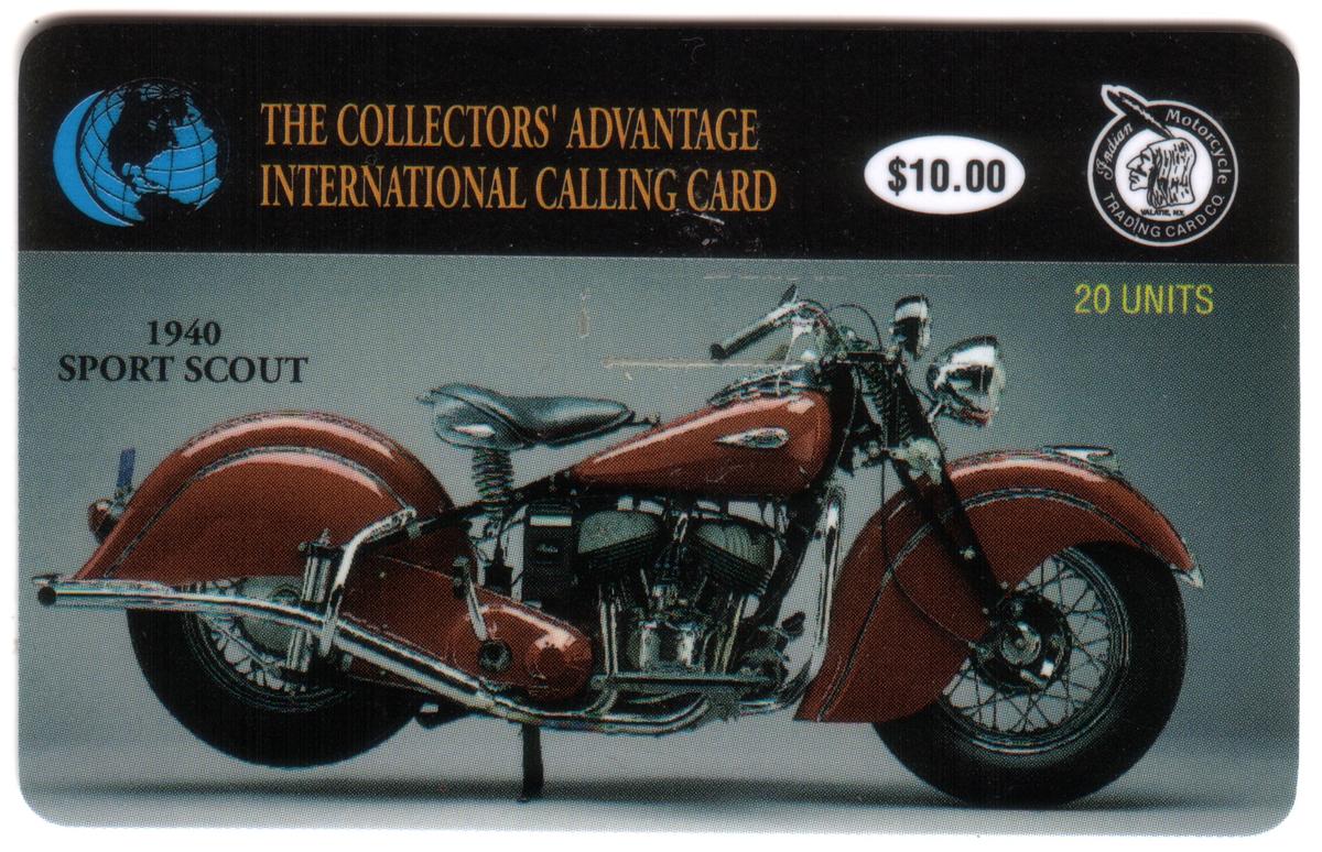 The card includes the text “$10” indicating its value and refers to Internet Communication Services Inc. The title “The Collectors’ Advantage” is prominently displayed, emphasizing its appeal to collectors. The overall presentation reflects themes of transportation, motorcycles, riding, and cycling. The card connects the heritage of the Indian Motorcycle brand with modern collectible phone card culture.