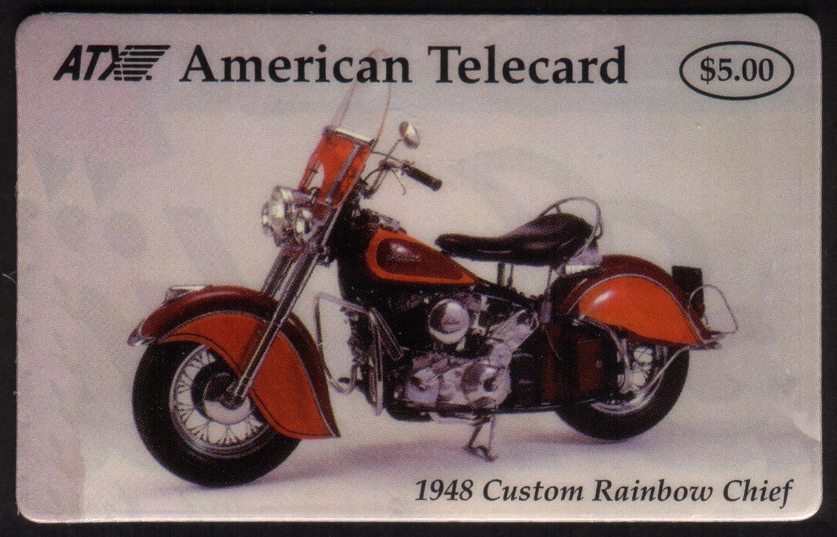 The first card, with a $5.00 value, displays a 1948 Custom Rainbow Chief motorcycle. The motorcycle is predominantly red with chrome and black engine components. It has a classic design with a prominent front fender, a black solo seat, a windshield, and whitewall tires. The card text includes "ATI American Telecard" at the top and "1948 Custom Rainbow Chief" at the bottom right.