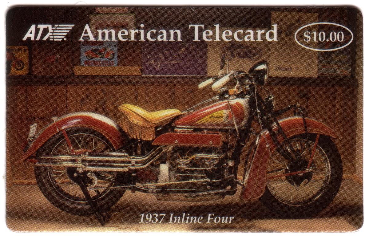 The second card, carrying a $10.00 value, shows a 1937 Inline Four motorcycle. The motorcycle is set against a wood-paneled background filled with vintage signs and decor. The bike has a brown and cream color scheme with a fringed tan leather seat. It features dual exhaust pipes on the left side, white grips on the handlebars, and spoked wheels. The card text reads "ATI American Telecard" at the top and "1937 Inline Four" at the bottom right.