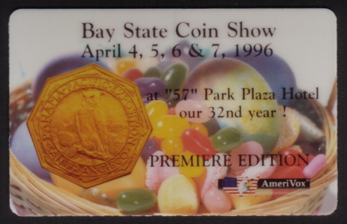 This collectible phone card features a detailed, colorful design centered around numismatics and coin collecting. Prominently displayed on the left side is an image of a large silver dollar coin alongside a gold coin, highlighting classic American currency. The setting evokes coin shows and collectors’ events, with references to the Bay State Coin Show held in Boston in April 1996. The card includes text elements that mention important themes such as “silver dollars currency,” “gold coins,” and “coin collecting,” emphasizing its focus on American numismatic culture.