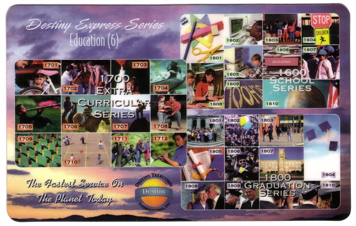 Additional imagery on the card includes bowling accessories, emphasizing sports and recreational activities commonly found in schools. A computer graphic represents technology and computer education. The card combines these diverse educational and extracurricular subjects to portray a comprehensive school experience. The words “Education #6/7: School, Curricular, Graduation JUMBO” and “Destiny Telecomm” are printed on the card, associating it with the Destiny Telecomm series.