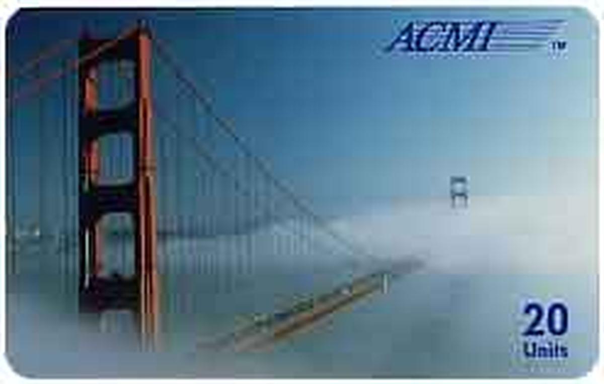 The card’s design includes the text "20u Golden Gate Bridge In The Clouds" along the right side, indicating a value of 20 units. The text “ACMI” is also present, signifying the card’s issuer or brand. The location “San Francisco CA” is printed near the lower edge, confirming the geographical subject of the image. The card’s layout places the image prominently, with clear, simple typography that does not distract from the scenic portrayal of this well-known piece of Americana.
