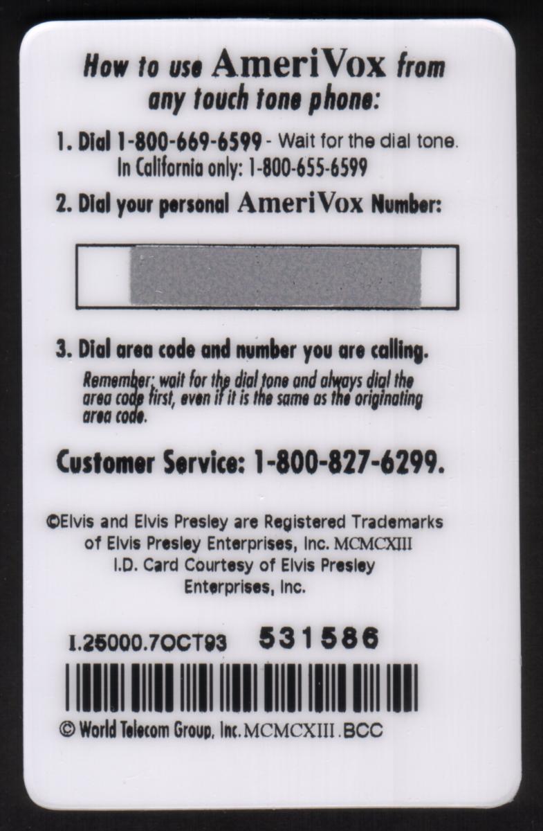 Elvis Presley themed prepaid card featuring his image, signature, Memphis address, and personal details, with AmeriVox branding and collectible appeal.