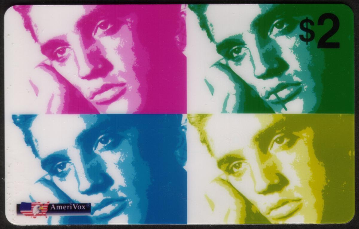 Pop art Elvis Presley design with four colorful quadrants, high-contrast stylized portrait, $2 value, AmeriVox branding, collectible prepaid phone card.