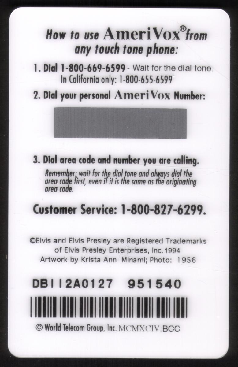 The lower left corner includes the AmeriVox logo, which incorporates an American flag motif alongside the company name. The card highlights Elvis Presley, the King of Rock and Roll, an iconic figure in American music and entertainment. The use of multiple color variations of the same image on one card creates a visually striking tribute to the famous singer and cultural icon.