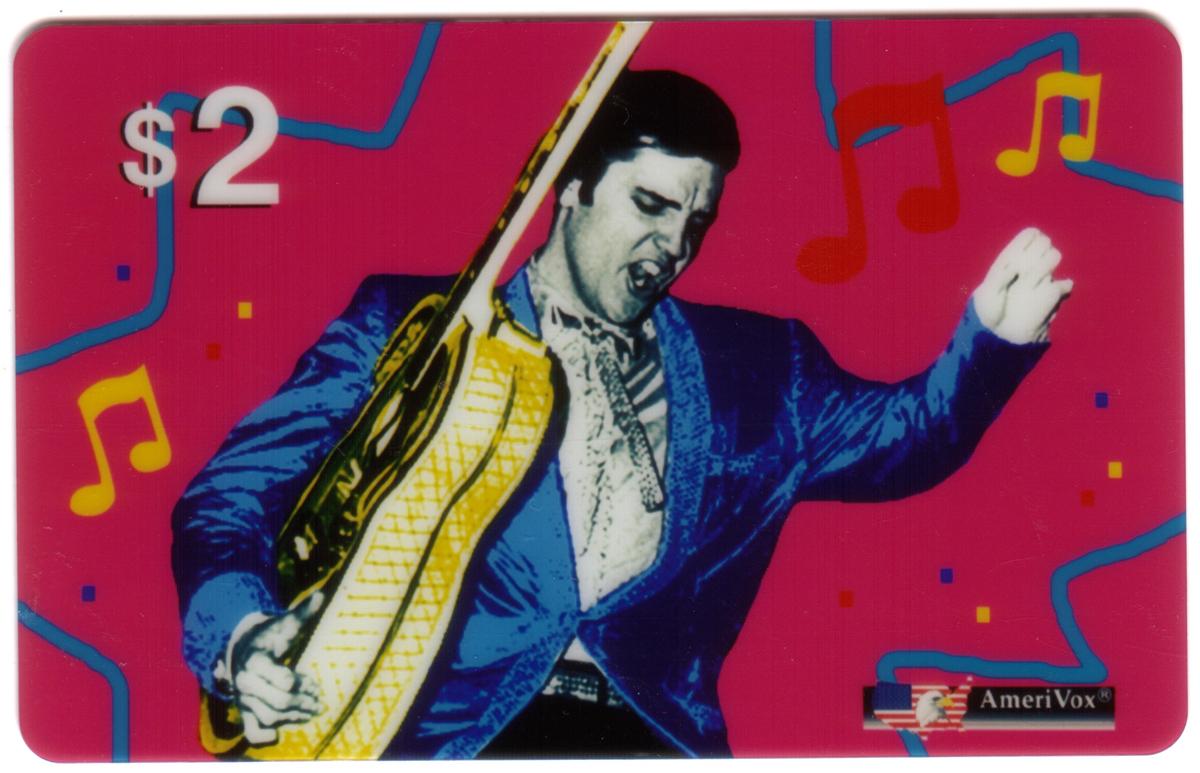 The card prominently displays the value "$2" in white text at the top left corner. At the bottom right corner, there is a small logo of AmeriVox accompanied by the American flag, indicating the card’s promotional origin. The overall design celebrates Elvis Presley as a significant American icon within entertainment, music, and celebrity culture.