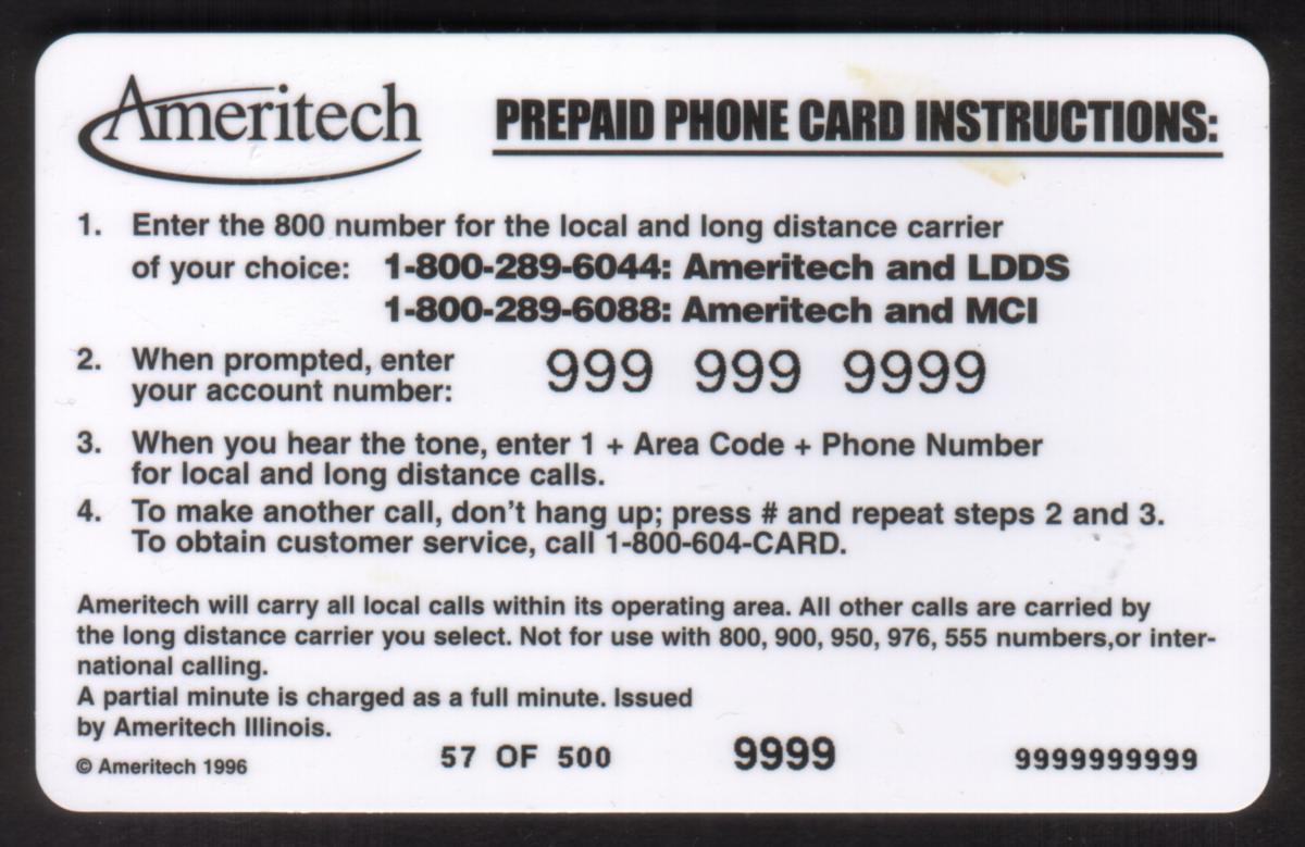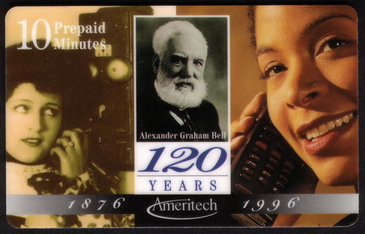This is a collectible Ameritech prepaid phone card commemorating the 120th anniversary of the first telephone call by Alexander Graham Bell, spanning the years 1876 to 1996. The card offers 10 prepaid minutes for telephone use.