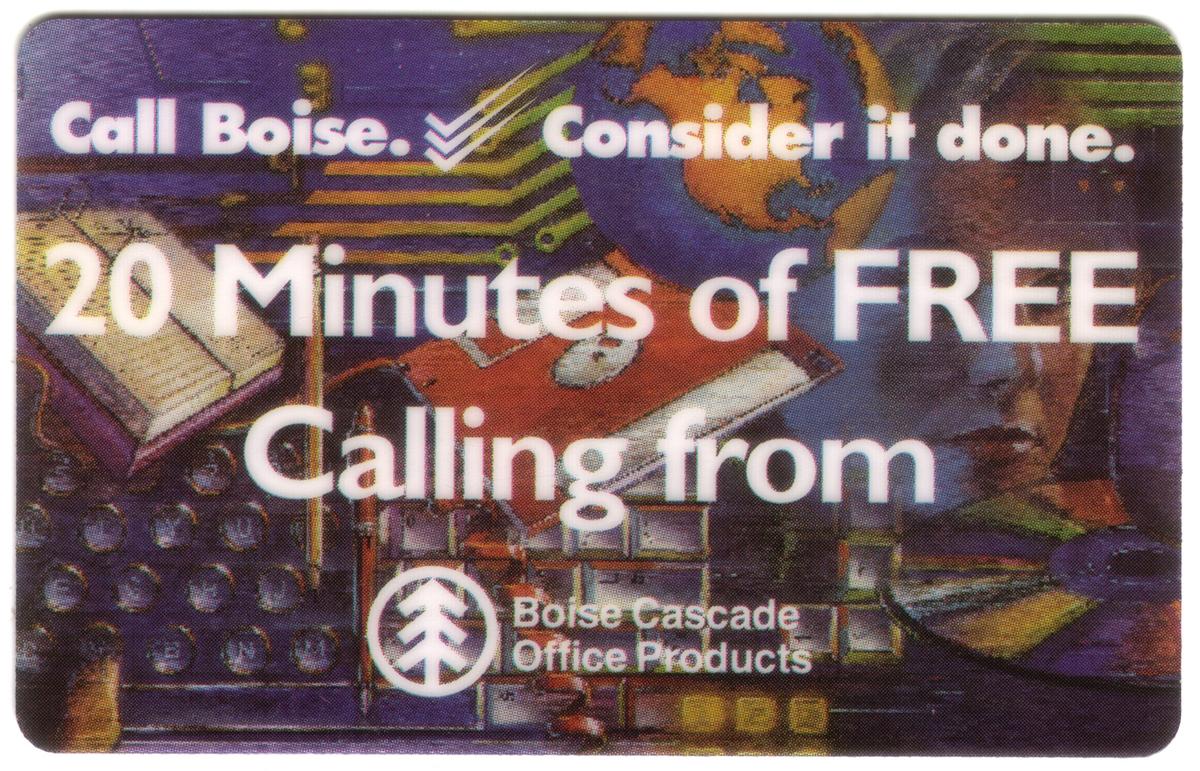 This collectible promotional phone card features a computer and electronics theme, prominently displaying a globe, a typewriter, and a floppy disk in its design. The card includes the text "20m Free," indicating a credit value of 20 minutes for phone usage. The card is issued by Ameritech and linked to Boise Cascade Office Products, showcasing a folder that is part of the imagery or promotional concept.