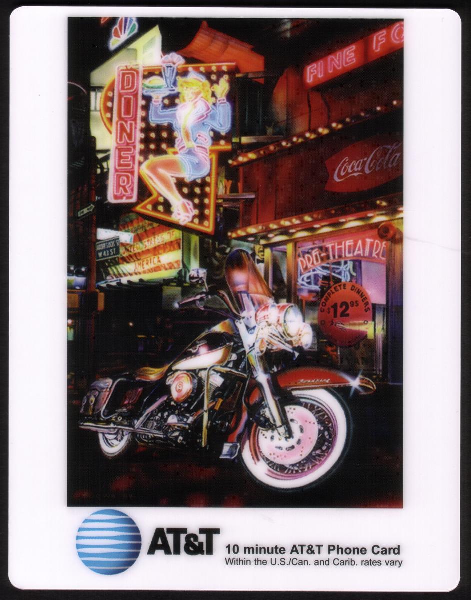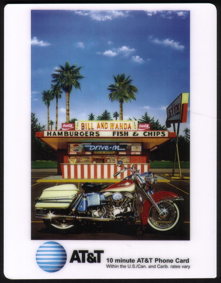All four cards prominently display the AT&T logo at the bottom along with the text "5 minute AT&T Phone Card Within the U.S., Can., and Carib. rates vary," identifying their function and geographic usage. The artworks blend themes of motorcycles, classic American roadside eateries, and well-known brand logos, rendered in vibrant acrylic paintings by James Gucwa.