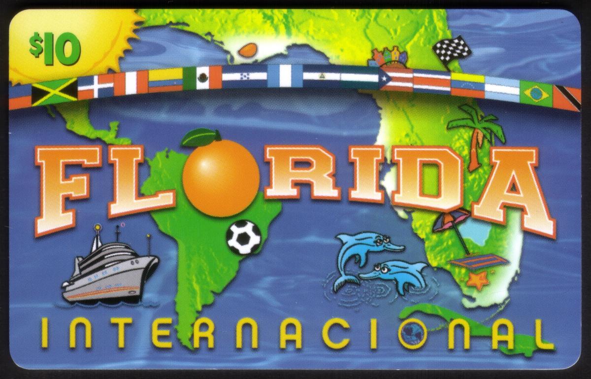 Vibrant $10 Florida Internacional card featuring a colorful map of Florida, Central America, Cuba, and South America with cultural and geographic symbols. |