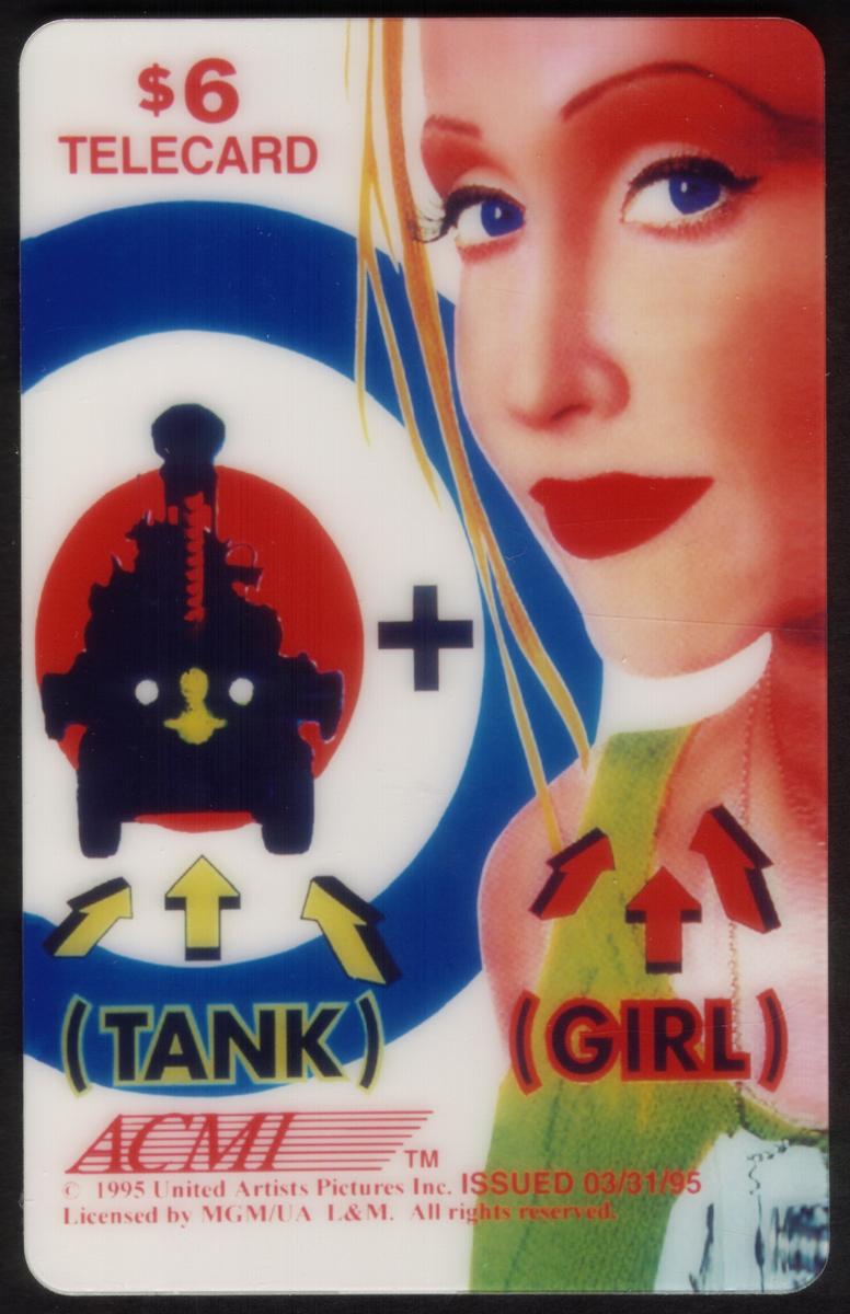 Vibrant $6 Telecard from 1995 featuring Tank Girl with bold tank and girl imagery, colorful design, and official licensing from United Artists.