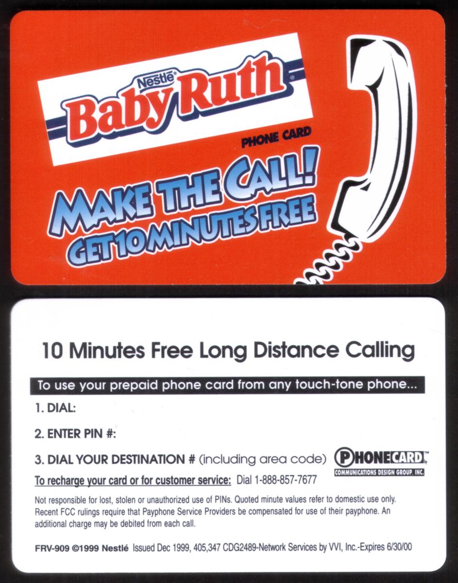 Promotional Nestlé Baby Ruth phone card offering 10 minutes free long-distance calls, featuring vibrant branding and usage instructions from the late 1990s.