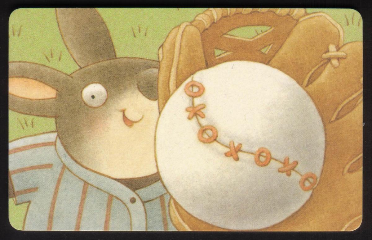 This collectible greeting card is from the 1995 Father's Day Series by Hallmark. It prominently features a cheerful bunny rabbit holding a baseball, wearing a baseball glove on one paw. The bunny is dressed in a blue shirt and an orange cap. The background includes a baseball diamond with a clear view of the infield and base paths, enhancing the baseball theme. The overall design blends elements of sports and celebration, emphasizing the connection to Father’s Day with text including “Father’s Day” and “hugs and kisses” visible on the front.