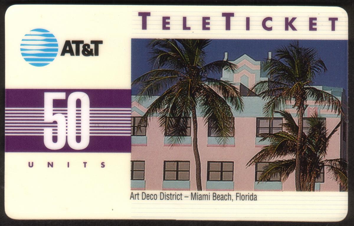 The card includes clear textual elements: at the top right corner, it states "GR4 50u" and "Miami Beach, Florida (Group 4)," identifying the location and the group designation. The lower right corner carries the "AT&T" logo in bold, blue letters paired with the name "teleticket," confirming it as an AT&T Teleticket phone card. The colors used throughout the card are soft pastel shades, reinforcing the classic Art Deco aesthetic and the sunny, inviting atmosphere of South Florida.
