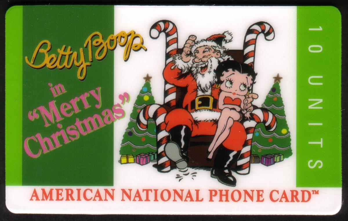 This collectible American National Phone Card features Betty Boop sitting on Santa Claus's lap, celebrating the Christmas holiday. Santa Claus is dressed in his classic red suit with black boots and a black belt, with two large candy canes positioned behind him, adding a festive touch to the scene. Betty Boop is wearing her signature short red dress and is seated comfortably on Santa's knee, looking cheerfully toward the viewer.