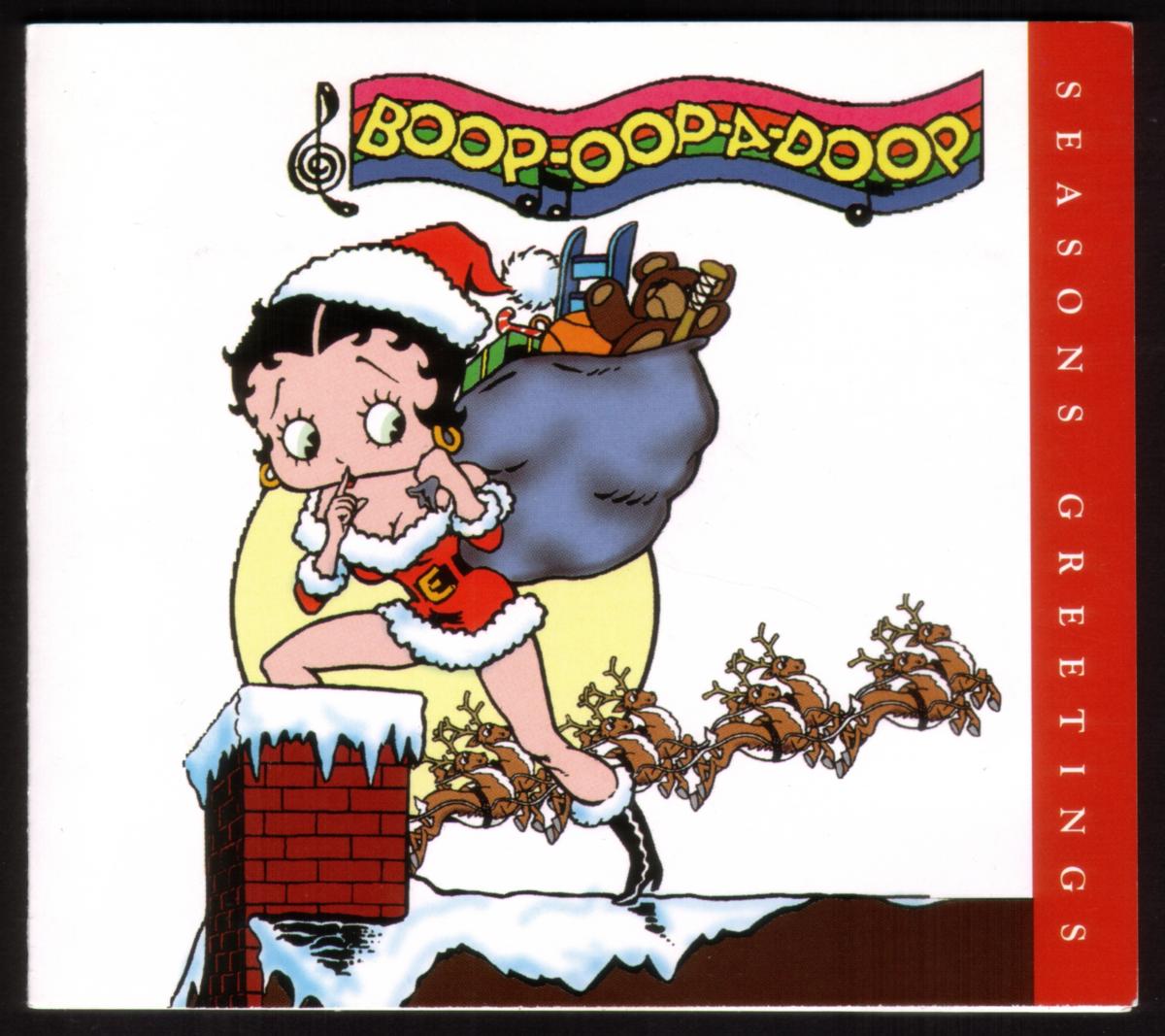 The entire design emphasizes a cheerful and festive Christmas atmosphere with iconic holiday imagery, featuring the well-known cartoon character Betty Boop along with traditional symbols like Santa Claus, candy canes, Christmas trees, and wrapped gifts.